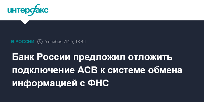 Москва. 5 ноября. INTERFAX.RU - Банк России выразил обеспокоенность необходимостью скорой - с 1 января 2026 г. - цифровой интеграции государственной корпорации "Агентство по страхованию вкладов" (АСВ) с системой электронного взаимодействия ФНС, просит сдвинуть дату для доработки IT-систем, сообщил "Интерфаксу" источник.