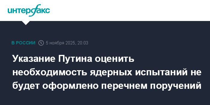 Москва. 5 ноября. INTERFAX.RU - Указание президента РФ Владимира Путина соответствующим ведомствам внести согласованные предложения о возможном начале работ по подготовке испытаний ядерного оружия не будет оформляться документально, списком поручений, сказал "Интерфаксу" пресс-секретарь президента Дмитрий Песков.