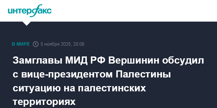 Москва. 5 ноября. INTERFAX.RU - Замминистра иностранных дел России Сергей Вершинин обсудил по телефону с вице-президентом Палестины, Хусейном Шейхом ситуацию на палестинских территориях с акцентом на ход реализации договоренностей о прекращении огня в секторе Газа и обмене удерживаемыми лицами, сообщил в среду МИД РФ.