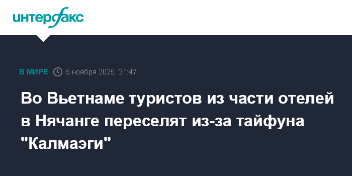 Москва. 5 ноября. INTERFAX.RU - Во Вьетнаме ждут приближения мощного тайфуна "Калмаэги", по информации Ассоциации туроператоров России, туристам из островных отелей на популярном у россиян курорте Нячанг предложили переселиться на материк.