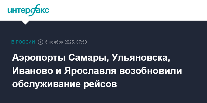 Москва. 6 ноября. INTERFAX.RU - Ограничения на прием и выпуск воздушных судов сняты в аэропортах Самары (Курумоч), Ульяновска (Баратаевка), Иваново (Южный) и Ярославля (Туношна) сообщил представитель Росавиации Артем Кореняко в телеграм-канале.