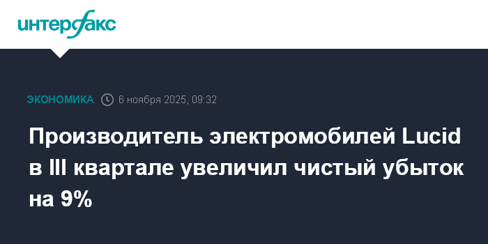 Москва. 6 ноября. INTERFAX.RU - Американский производитель электромобилей Lucid Group Inc. в третьем квартале увеличил чистый убыток на 9%, при этом выручка не оправдала ожиданий экспертов.