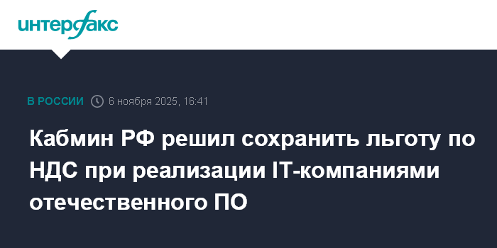 Москва. 6 ноября. INTERFAX.RU - Правительство РФ при рассмотрении поправок к проекту федерального бюджета на 2026-2028 годы учло пожелания бизнеса и предлагает сохранить льготу по НДС при реализации IT-компаниями программного оборудования собственных разработок. Об этом премьер-министр РФ Михаил Мишустин сообщил на заседании правительства.