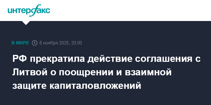 "15 октября 2025 года прекращено действие Соглашения между правительством Российской Федерации и правительством Литовской Республики о поощрении и взаимной защите капиталовложений, подписанного в Москве 29 июня 1999 года", - говорится в сообщении российского внешнеполитического ведомства, размещенном в четверг на официальном портале правовой информации.