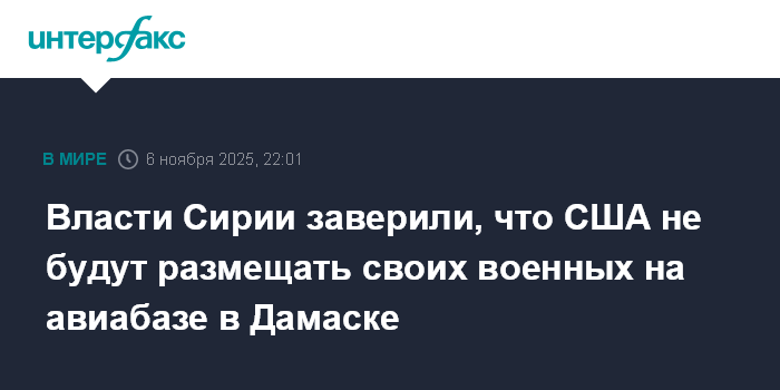 Москва. 6 ноября. INTERFAX.RU - Сообщения о том, что США разместят свой контингент на авиабазе в Дамаске, не соответствуют действительности, сообщает в четверг агентство САНА со ссылкой на источник в МИД САР.