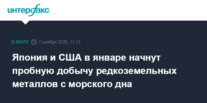 Москва. 7 ноября. INTERFAX.RU - Япония и США, заключившие в октябре соглашение по редкоземельным металлам, собираются в январе 2026 года начать в тестовом режиме добычу этих ресурсов со дна Тихого океана, сообщает в пятницу Bloomberg.