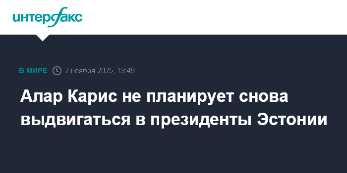 Москва. 7 ноября. INTERFAX.RU - Президент Эстонии Алар Карис заявил, что с большой вероятностью не будет участвовать в выборах на второй срок, сообщает ERR.ee со ссылкой на его выступление в эфире Vikerraadio.