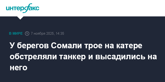 Москва. 7 ноября. INTERFAX.RU - У берегов Сомали три человека на катере обстреляли из пулеметов и гранатометов танкер с нефтепродуктами, взошли на борт и пытаются его захватить, сообщает АР.