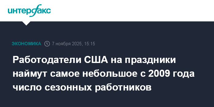 Консалтинговая компания Challenger, Gray & Christmas ожидает, что американские работодатели в последние три месяца 2025 года привлекут менее 500 тысяч сезонных работников, что является минимумом с 2009 года.