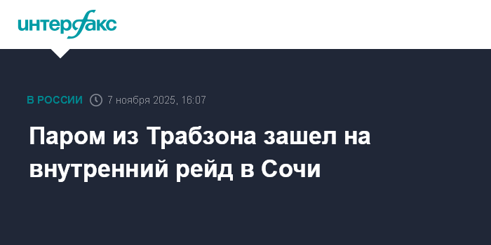 Москва. 7 ноября. INTERFAX.RU - Грузопассажирский паром из Трабзона зашел на внутренний рейд в акватории Сочи для необходимых процедур, сообщил в пятницу "Интерфаксу" руководитель компании - организатора маршрута ООО "СВС ШИППИНГ" Сергей Туркменян.