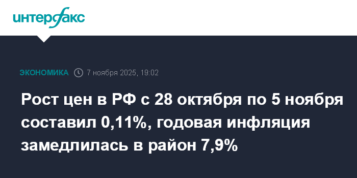 Рост цен в РФ с 28 октября по 5 ноября составил 0,11%, годовая инфляция замедлилась в район 7,9%