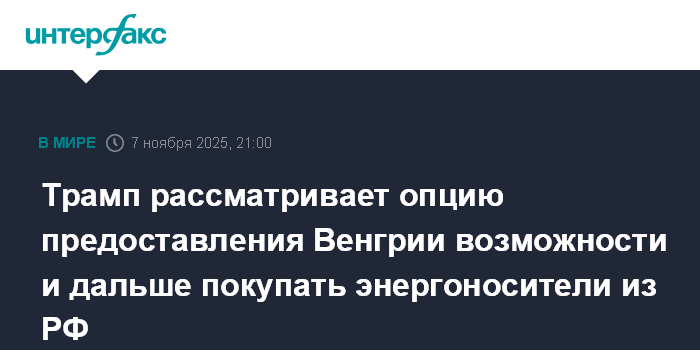 Москва. 7 ноября. INTERFAX.RU - Президент США Дональд Трамп в пятницу заявил, что изучает возможность сделать исключение из-под санкций для Венгрии в том, что касается российских энергоносителей.