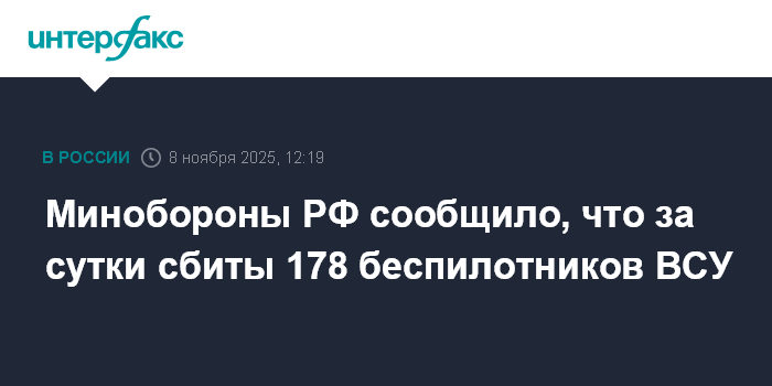 Минобороны РФ сообщило, что за сутки сбиты 178 беспилотников ВСУ