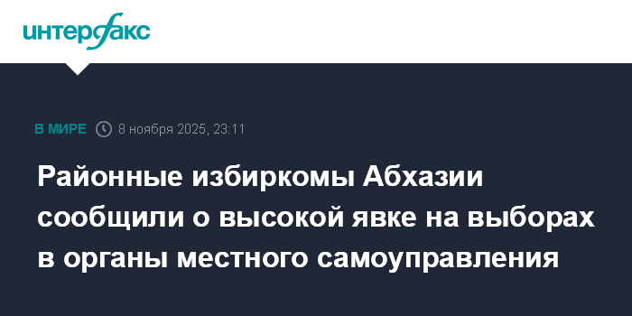 Москва. 8 ноября. INTERFAX.RU - В Абхазии завершились выборы депутатов органов местного самоуправления, по данным избирательных комиссий, установленный законом 25%-й порог был преодолен на большинстве участков еще в 18:00.
