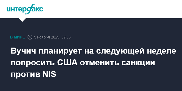 Москва. 9 ноября. INTERFAX.RU - Президент Сербии Александр Вучич намерен в начале следующей недели попросить США отменить решение о санкциях в отношении сербской компании NIS, сообщает телеканал РТС.