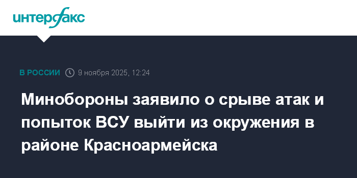 Москва. 9 ноября. INTERFAX.RU - Российские военные отразили семь украинских атак и восемь попыток выйти из окружения в районе Красноармейска (Покровска), сообщило Минобороны РФ в воскресенье.