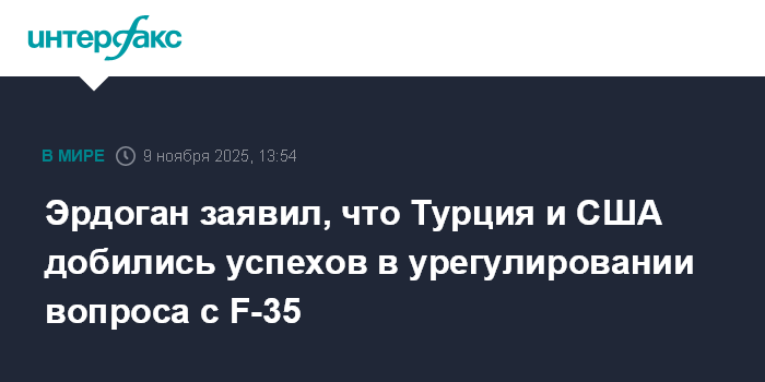 Москва. 9 ноября. INTERFAX.RU - Анкара и Вашингтон продолжают решать проблему с исключением Турции из программы производства истребителей-бомбардировщиков F-35, стороны достигли успехов по этой теме, заявил турецкий президент Реджеп Тайип Эрдоган.