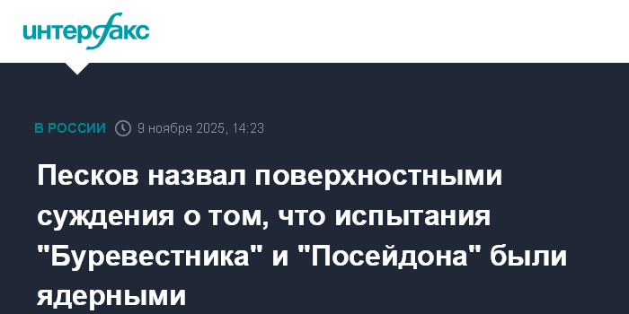 Москва. 9 ноября. INTERFAX.RU - Специалисты США не должны делать ошибок в своих суждениях касательно испытаний "Буревестника" и "Посейдона" на атомной энергетической установке, это не является испытанием ядерного оружия, заявил пресс-секретарь президента РФ Дмитрий Песков.