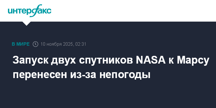 Москва. 10 ноября. INTERFAX.RU - Запуск двух спутников NASA в рамках миссии EscaPADE к Марсу для изучения его магнитосферы, планировавшийся в воскресенье, перенесен из-за непогоды, сообщила компания-разработчик ракеты-носителя New Glenn компании Blue Origin.