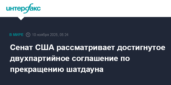 Москва. 10 ноября. INTERFAX.RU - Сенат США в настоящее время рассматривает сделку между республиканцами и демократами, которая позволит прекратить шатдаун и возобновить работу правительства, приостановленную 1 октября в связи тем, что Конгресс не смог согласовать законопроект о продлении финансирования федеральных ведомств.