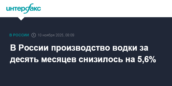 Москва. 10 ноября. INTERFAX.RU - В России производство водки в январе-октябре 2025 года уменьшилось на 5,6% в годовом исчислении, до 60,8 млн декалитров (дал), сообщает Росалкогольтабакконтроль.