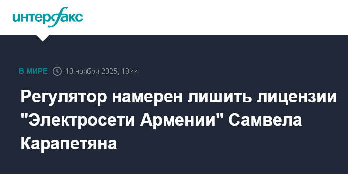 Москва. 10 ноября. INTERFAX.RU - Комиссия по регулированию общественных услуг (КРОУ) Армении намерена лишить ЗАО "Электрические сети Армении" (ЭСА) лицензии на распределение электрической энергии.