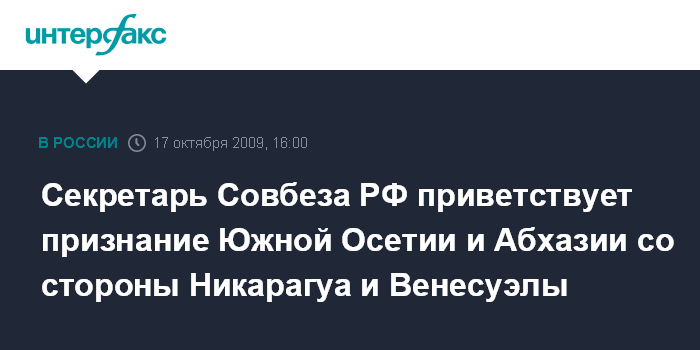 Москва. 17 октября. INTERFAX.RU - Решение Никарагуа и Венесуэлы признать независимость Абхазии и Южной Осетии свидетельствует о смелости политики этих латиноамериканских государств, заявил секретарь Совета безопасности РФ Николай Патрушев.