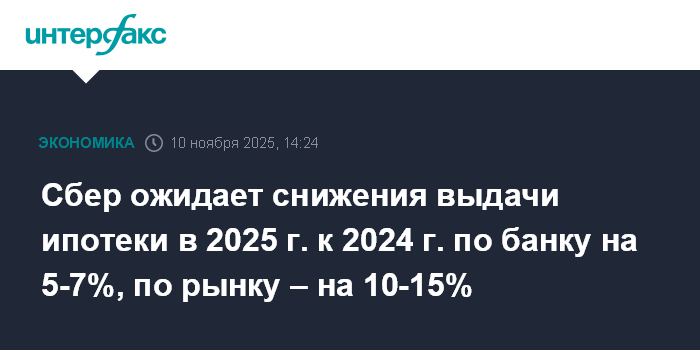 Москва. 10 ноября. INTERFAX.RU - Сбербанк в 2025 году прогнозирует падение выдачи ипотеки по сравнению с 2024 годом по банку на 5-7%, по сектору - на 10-15%, заявил президент - председатель правления банка Герман Греф на встрече с президентом РФ Владимиром Путиным.