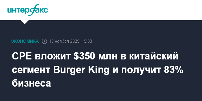 CPE вложит $350 млн в китайский сегмент Burger King и получит 83% бизнеса