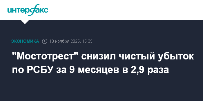 Москва. 10 ноября. INTERFAX.RU - ПАО "Мостотрест" снизило чистый убыток по РСБУ в январе-сентябре 2025 года в 2,9 раза, до 110,3 млн рублей, говорится в отчетности компании.
