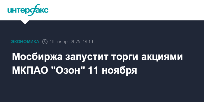 Москва. 10 ноября. INTERFAX.RU - Торги акциями МКПАО "Озон" на Московской бирже начнутся 11 ноября, говорится в сообщении торговой площадки.