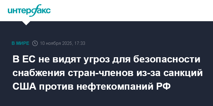 В ЕС не видят угроз для безопасности снабжения стран-членов из-за санкций США против нефтекомпаний РФ