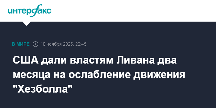 Москва. 10 ноября. INTERFAX.RU - Прибывшая в Ливан американская делегация предоставила Бейруту два месяца для принятия мер, которые снизят финансовые и военные возможности ливанского движения "Хезболла", сообщает в понедельник LBCI со ссылкой на источники.