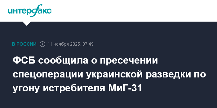 Москва. 11 ноября. INTERFAX.RU - ФСБ пресекла операцию украинской военной разведки под кураторством Великобритании, в ходе которой планировалось завербовать российских летчиков и угнать сверхзвуковой истребитель МиГ-31, сообщил во вторник Центр общественных связей (ЦОС) спецслужбы.
