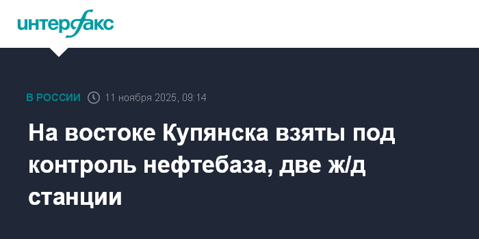 Москва. 11 ноября. INTERFAX.RU - Российские подразделения взяли под контроль нефтебазу на востоке Купянска, а также две железнодорожные станции.