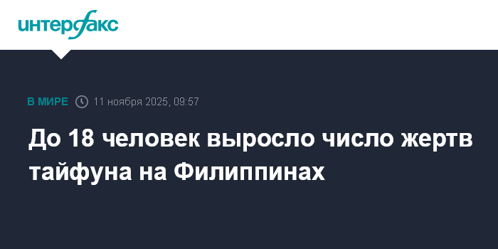 Москва. 11 ноября. INTERFAX.RU - Число погибших в результате удара тайфуна "Фунг-Вонг" на северо-западе Филиппин увеличилось до 18 человек, сообщает во вторник Associated Press.