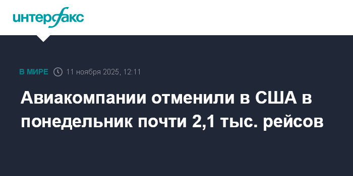 Москва. 11 ноября. INTERFAX.RU - Авиакомпании отменили в США в понедельник почти 2,1 тыс. рейсов, по данным аналитической компании Cirium на 18:15 понедельника по времени Восточного побережья страны (2:15 мск вторника).