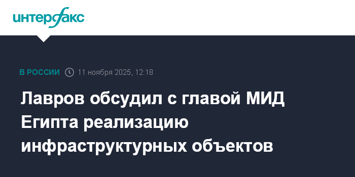 Москва. 11 ноября. INTERFAX.RU - Глава МИД РФ Сергей Лавров обсудил по телефону с коллегой из Египта Бадром Абдельати расширение сотрудничества между Москвой и Каиром, перспективы реализации инфраструктурных проектов, сообщили на Смоленской площади.