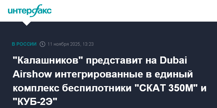 Москва. 11 ноября. INTERFAX.RU - Интегрированные в единый комплекс беспилотники "СКАТ 350М" и "КУБ-2Э" будут впервые представлены на международной авиационно-космической выставке Dubai Airshow 2025, которая пройдет с 17 по 21 ноября, сообщили в пресс-службе "Калашникова" во вторник.