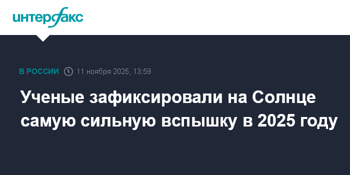 Москва. 11 ноября. INTERFAX.RU - Самая сильная вспышка с октября 2024 года произошла на Солнце, достигнув уровня Х5.16, сообщили во вторник в лаборатории солнечной астрономии Института космических исследований (ИКИ) и Института солнечно-земной физики (ИСЗФ) РАН.