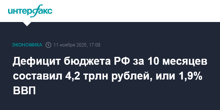 Дефицит бюджета РФ за 10 месяцев составил 4,2 трлн рублей, или 1,9% ВВП