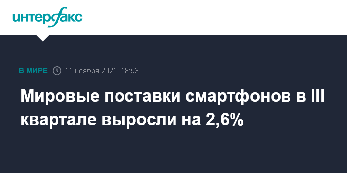 Москва. 11 ноября. INTERFAX.RU - Поставки смартфонов в мире в третьем квартале 2025 года выросли на 2,6% относительно того же периода прошлого года и составили 322,7 млн штук, по предварительным расчетам International Data Corporation.