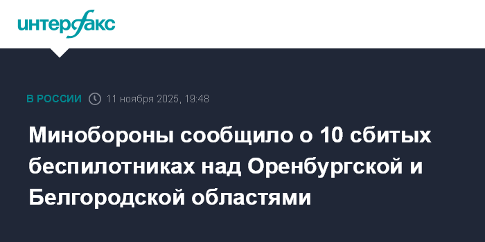 Минобороны сообщило о 10 сбитых беспилотниках над Оренбургской и Белгородской областями