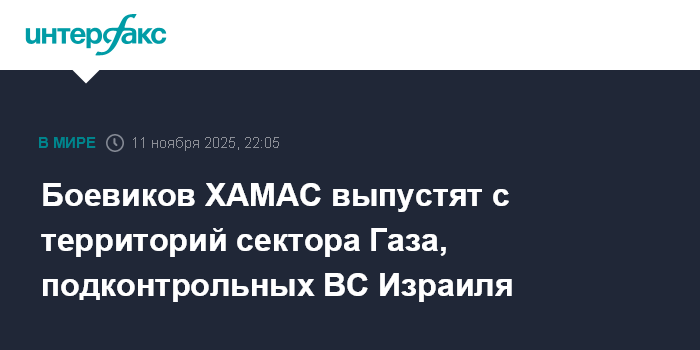 Москва. 11 ноября. INTERFAX.RU - Израиль и США достигли компромисса, которое позволит уйти примерно 200 боевиков ХАМАС, находящимся в секторе Газа в туннелях на территориях под контролем Армии обороны Израиля, пишет The Jerusalem Post со ссылкой на источники.
