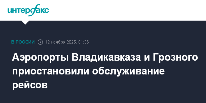 Москва. 12 ноября. INTERFAX.RU - Ограничения на прием и выпуск воздушных судов введены в аэропортах Владикавказа (Беслан) и Грозного (Северный), сообщил представитель Росавиации Артем Кореняко в телеграм-канале.