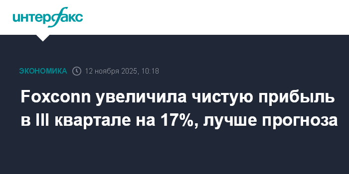 Москва. 12 ноября. INTERFAX.RU - Тайваньская Hon Hai Precision Industry Co. (Foxconn Technology), крупнейший в мире производитель электроники по контрактам и поставщик Apple, увеличила чистую прибыль в третьем квартале на 17%, сильнее прогнозов рынка.