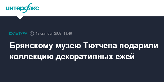 Брянск. 18 октября. INTERFAX.RU - Московский искусствовед Нина Рыбакова передала в дар музею-заповеднику Федора Тютчева "Овстуг" коллекцию ежей, сообщили "Интерфаксу" в пресс-службе администрации Брянской области.
