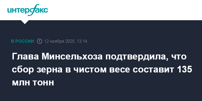 Глава Минсельхоза подтвердила, что сбор зерна в чистом весе составит 135 млн тонн