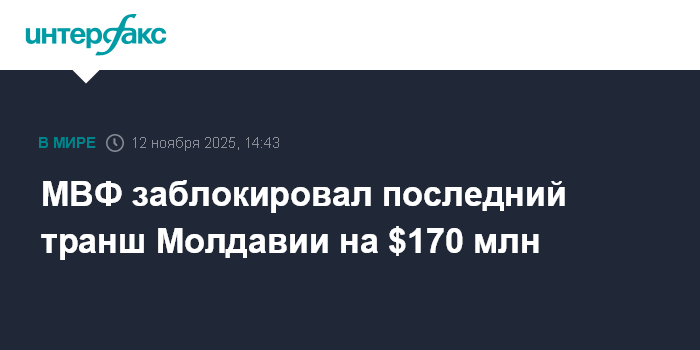 Москва. 12 ноября. INTERFAX.RU - Международный валютный фонд (МВФ) заблокировал последний транш, который должен был поступить в Молдавию в рамках рассчитанной на 40 месяцев программы сотрудничества с правительством страны, на 2,9 млрд леев ($170 млн). Об этом сообщил председатель парламентской комиссии по экономике, бюджету и финансам Раду Мариан журналистам в среду.