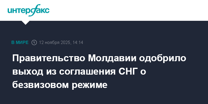 Москва. 12 ноября. INTERFAX.RU - Правительство Молдавии одобрило денонсацию соглашения о безвизовом режиме и еще шести соглашений, подписанных в рамках СНГ, сообщили "Интерфаксу" в пресс-службе правительства.